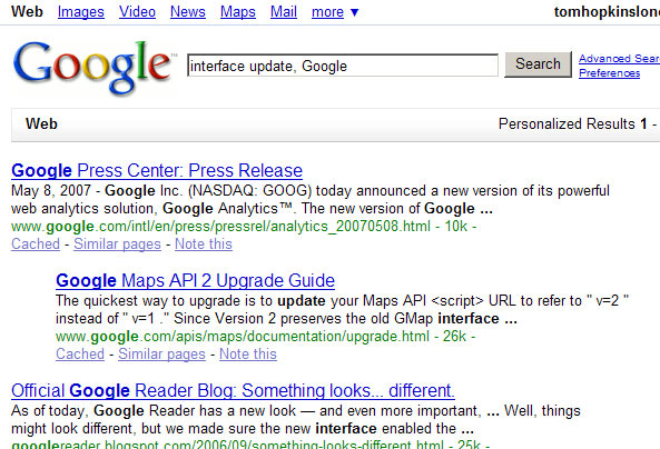 A small but significant UI change in Google shows how they plan to go about world domination. Lovely simple cross selling of their services and building a suite almost as if they could hear this excellent interview with Jakob Neilsen when he compares them to Yahoo! At the same time, they’re pushing out the personalised search.