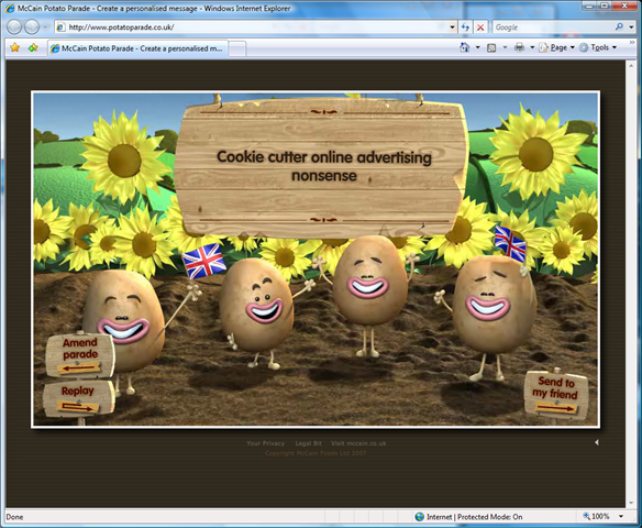 So back to the potato campaign. It says, “TELL ME THE NAME OF YOUR FRIEND: (cool animation)”, and then – rather than just saying “HELLO <your friend’s name>” – it creates an animation of dancing potatoes, which I’m then supposed to email on to my friend, colleague, mother, ‘sweetheart’ etc with their name in the animation.