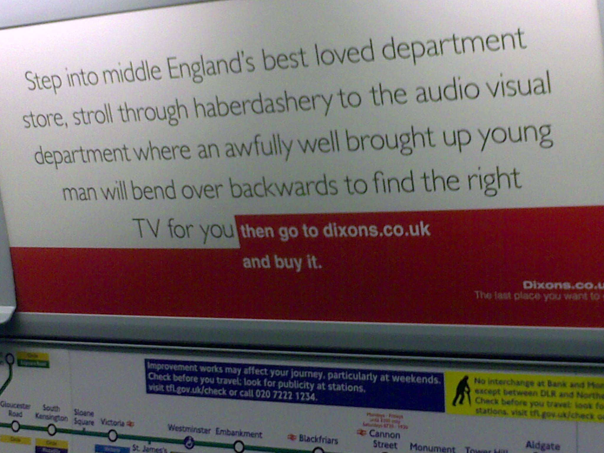 I would love to see the testing results about how this ad influences intention. For those who understand it at all, I’d imagine it’s more likely to drive people to the doors of Dixons’ competitors than to include Dixons in their online repertoire. In part because the younger, smarter audience understands the concept of price comparison, and in part because, in the hustle and bustle of the tube, or wherever you see these ads, people may not even spend long enough to know they’re not for Harrods, Selfridges or John Lewis. An interesting test is whether you’d ever run this creative on the web? When price comparison is one click away, they suddenly seem completely unusable.